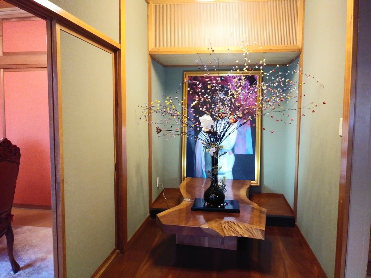 ↑お庭を抜け、民家の玄関としか思えない入口から入ると、真っ先に目に入るのは美しい花と絵画です。