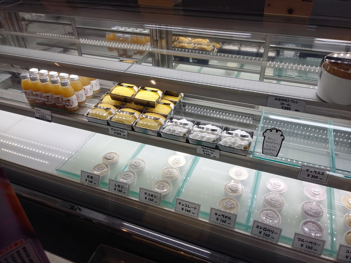今朝取れたての卵のほか、プリンやシフォンケーキ、生クリームなどが並んでいます。