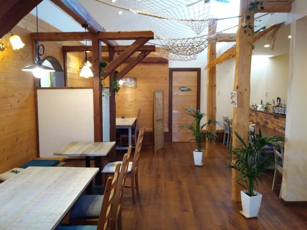 外観のイメージと異なり、天井のハンモックや植栽など南国・ハワイアン風です。