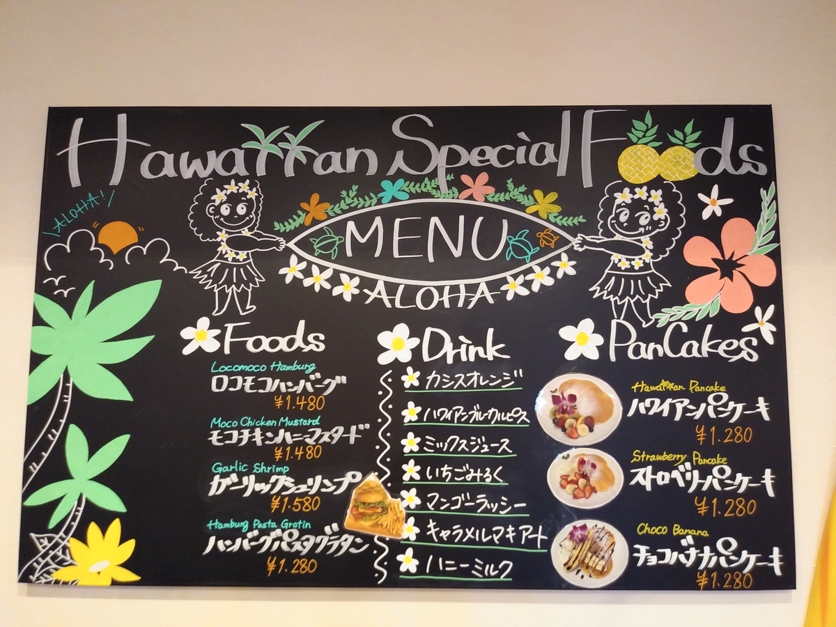 ロコモコハンバーグやハワイアンパンケーキなど、ハワイ料理が中心です。