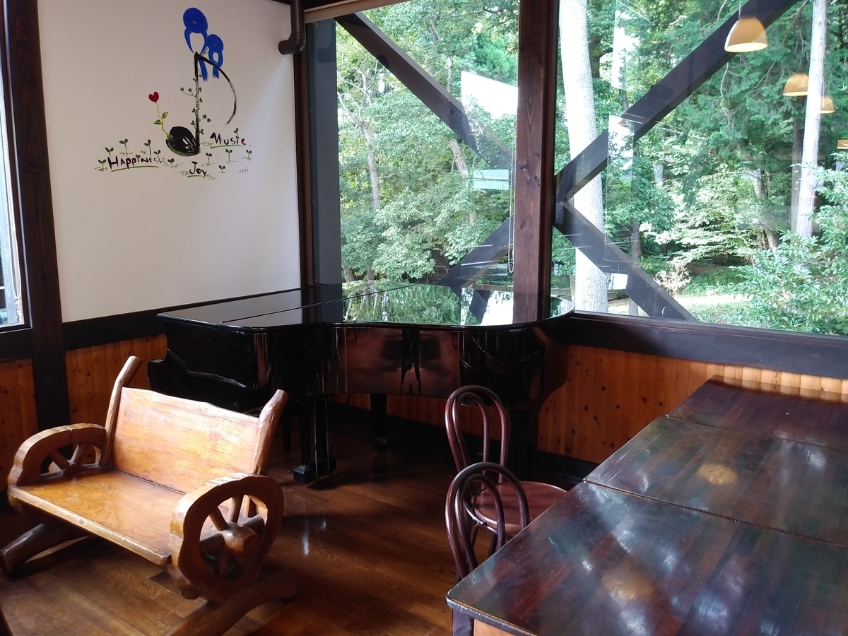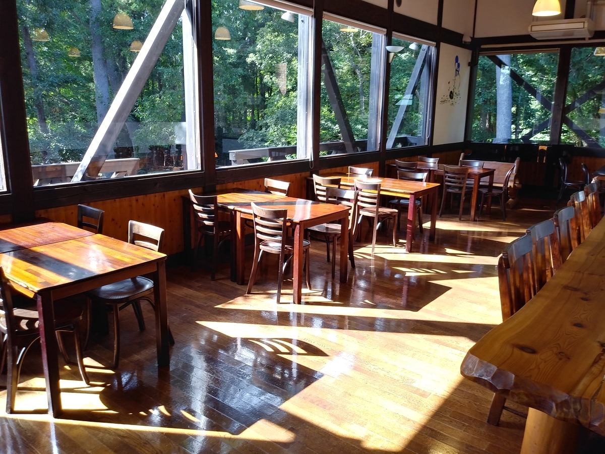 木製の室内と、外の森林と一体になり、広い森の中にいるような印象です。