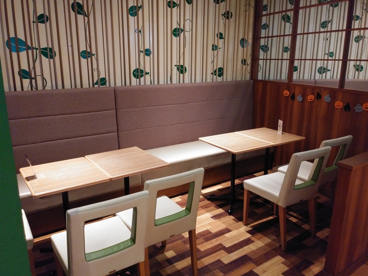 シンプルなテーブル席、壁のハロウィン飾りが可愛らしいです。