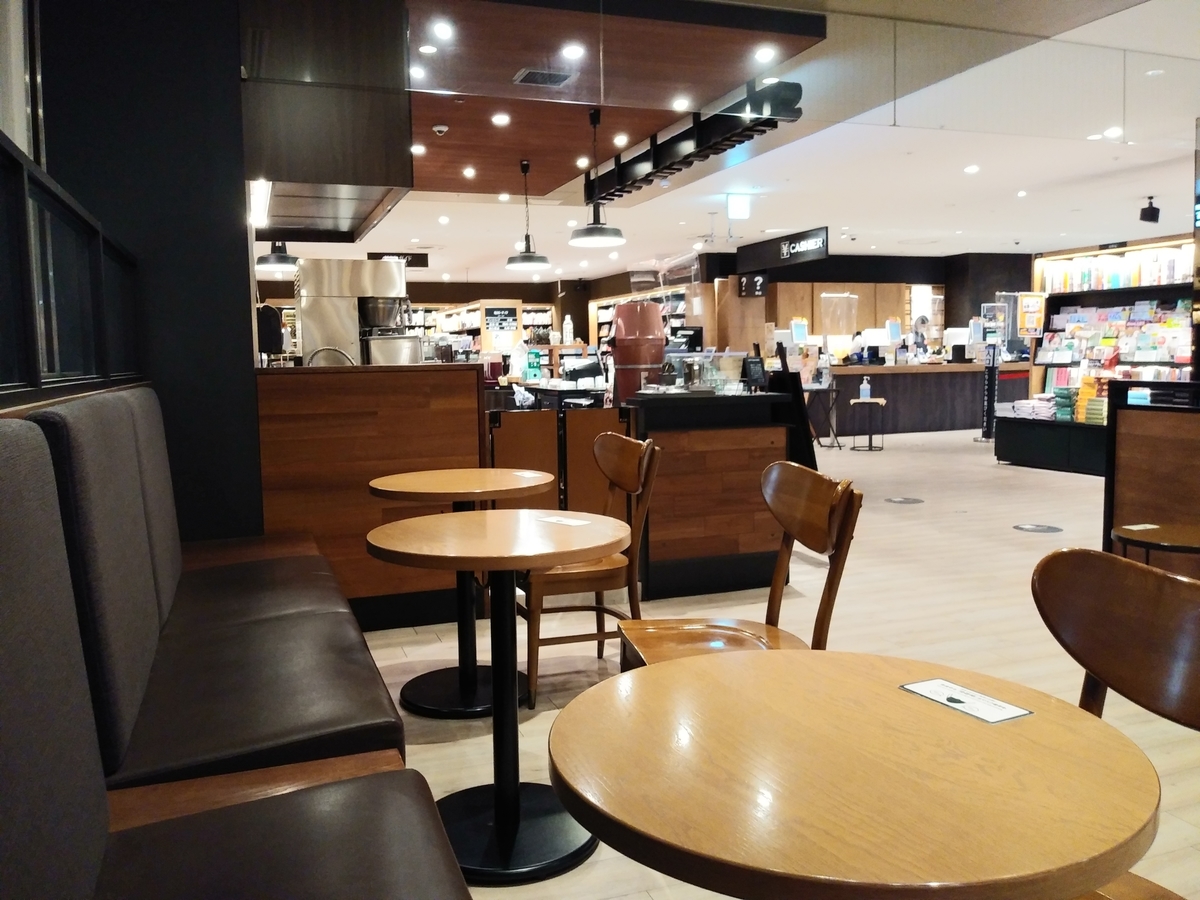 周囲を本棚に囲まれており、中央部がカフェになっています(書店との境目がほとんどありません)。