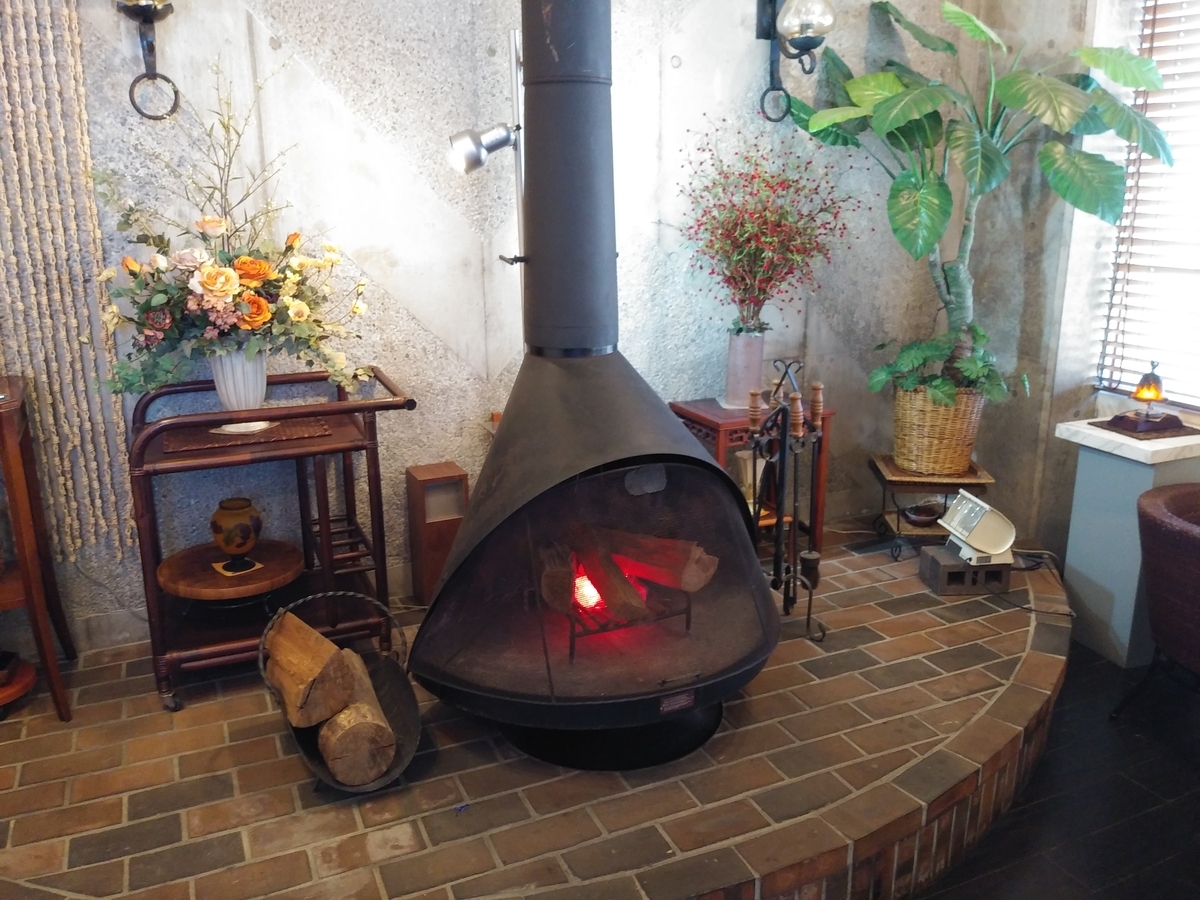 下に敷かれたレンガといい、隣の薪といい、(いい意味で)室内とは思えない雰囲気・・・