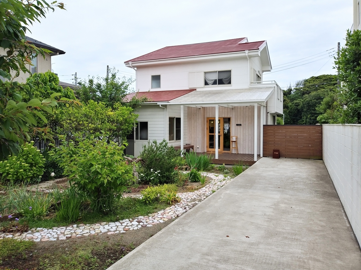 ↑素敵なお庭の奥にある白い建物の一軒家。