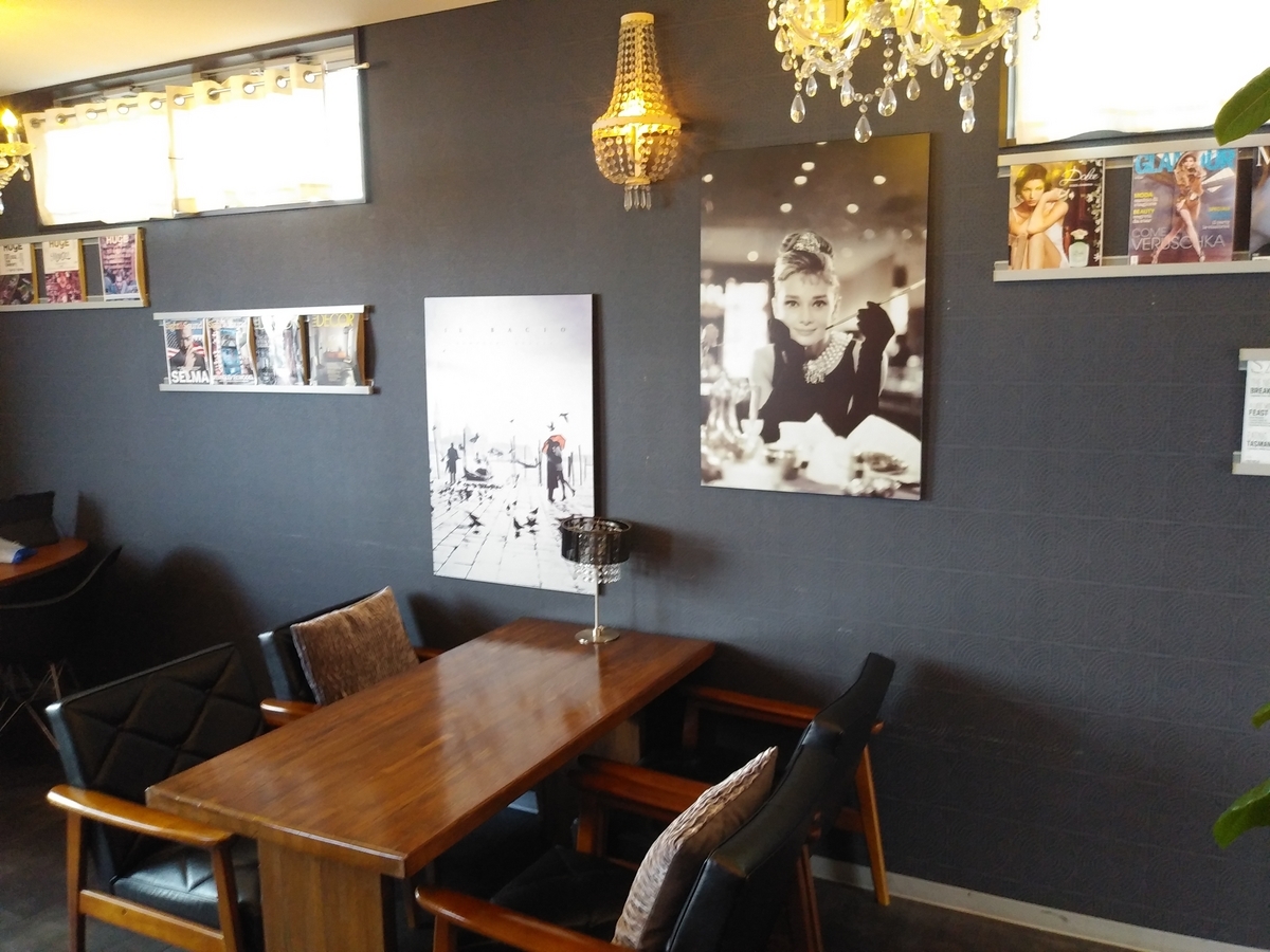 木のテーブルやシャンデリア、展示されている写真などが店内を彩っています。