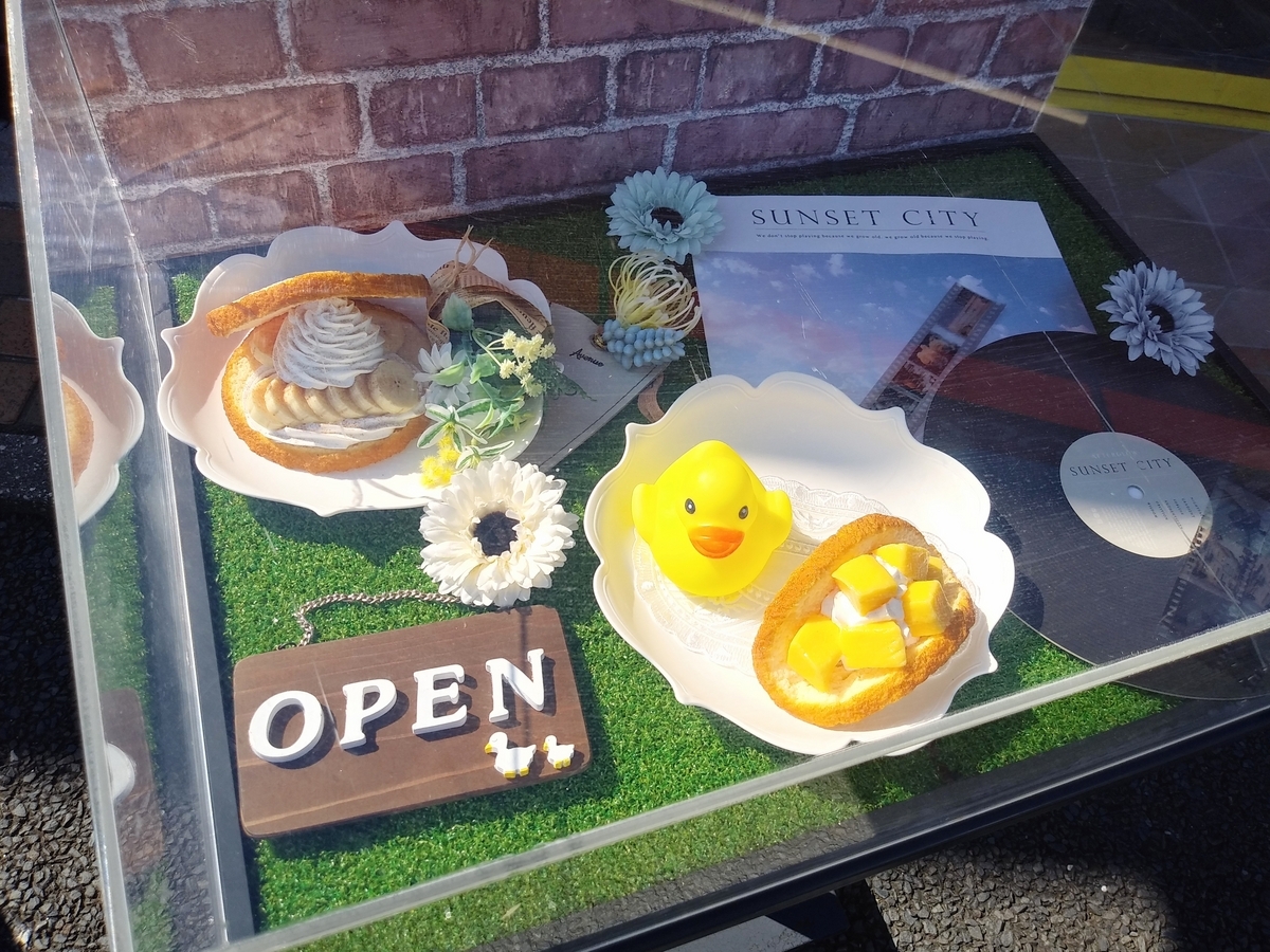 店内のところどころに見える黄色はあひるの置物やぬいぐるみです。