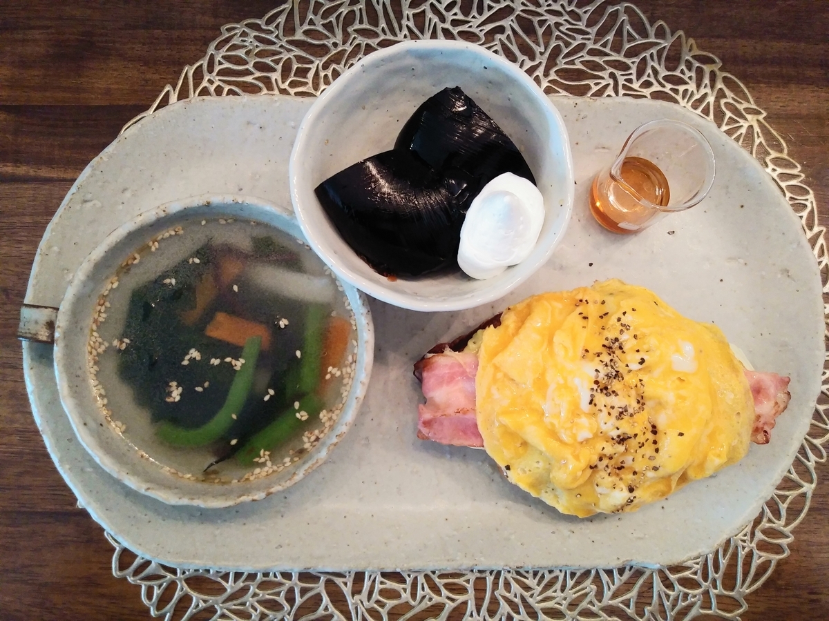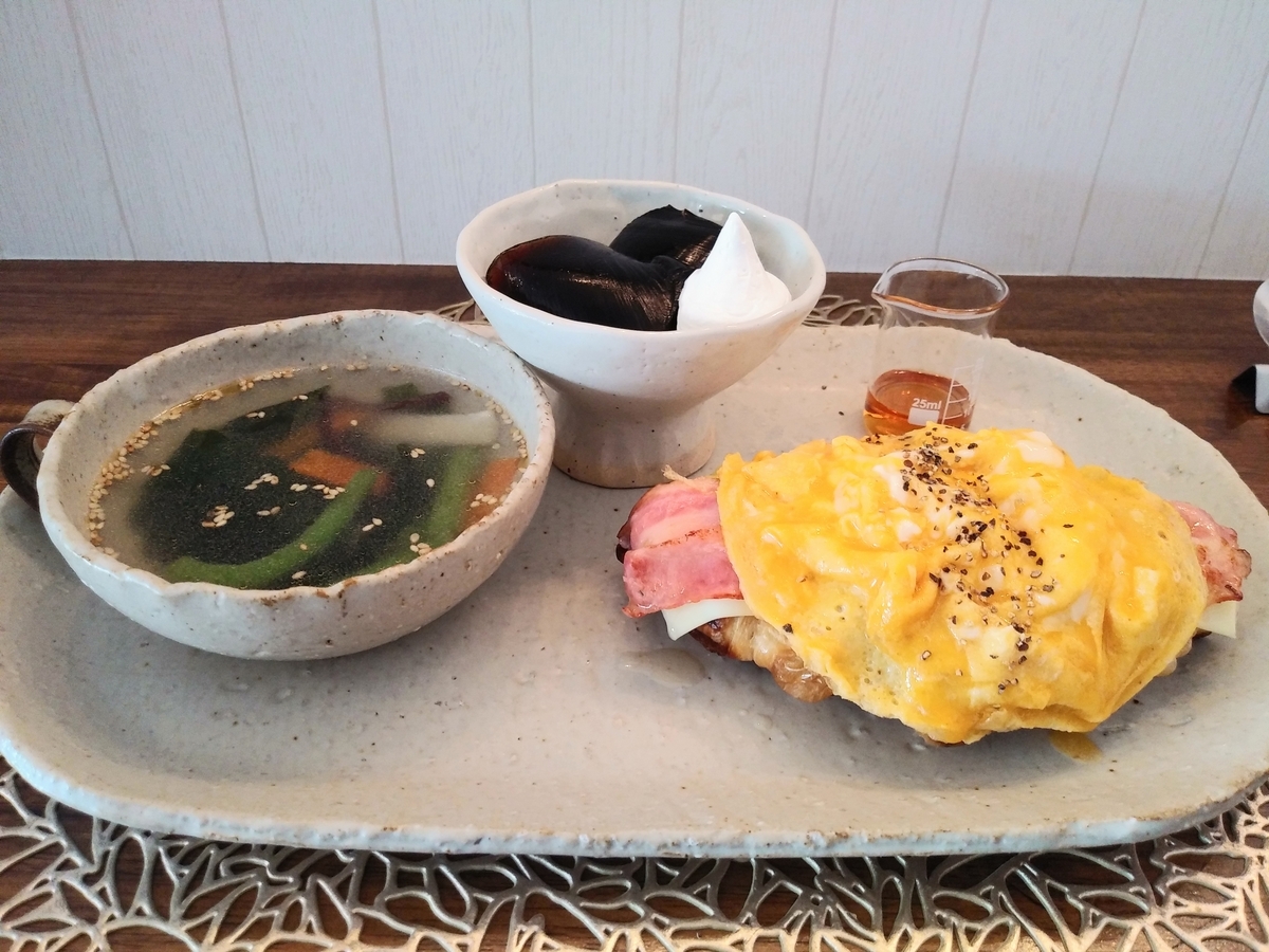 ↑クロッフルサンド(ベーコンエッグチーズ)、スープ、コーヒーゼリーのランチセット。