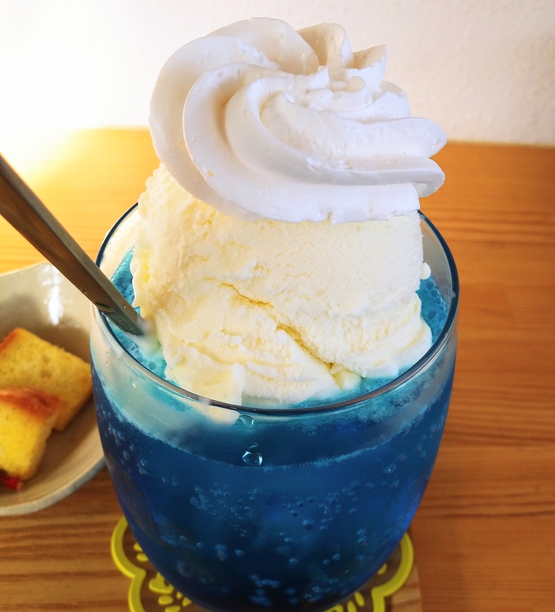 海を思わせる青色の炭酸の上に、まんまるのアイスクリーム、さらにその上に生クリームという組合せ。