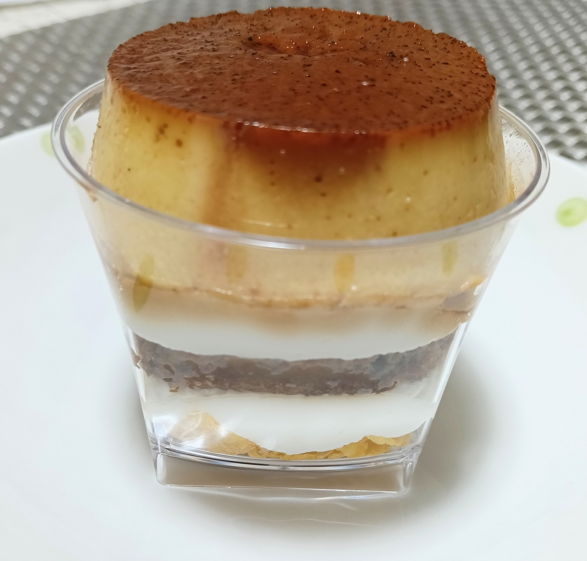 ちょっと固めのしっかり食感のプリン、しっとりして味の浸み込んだティラミス、そして一番下にはコーンフレークという組合せ。