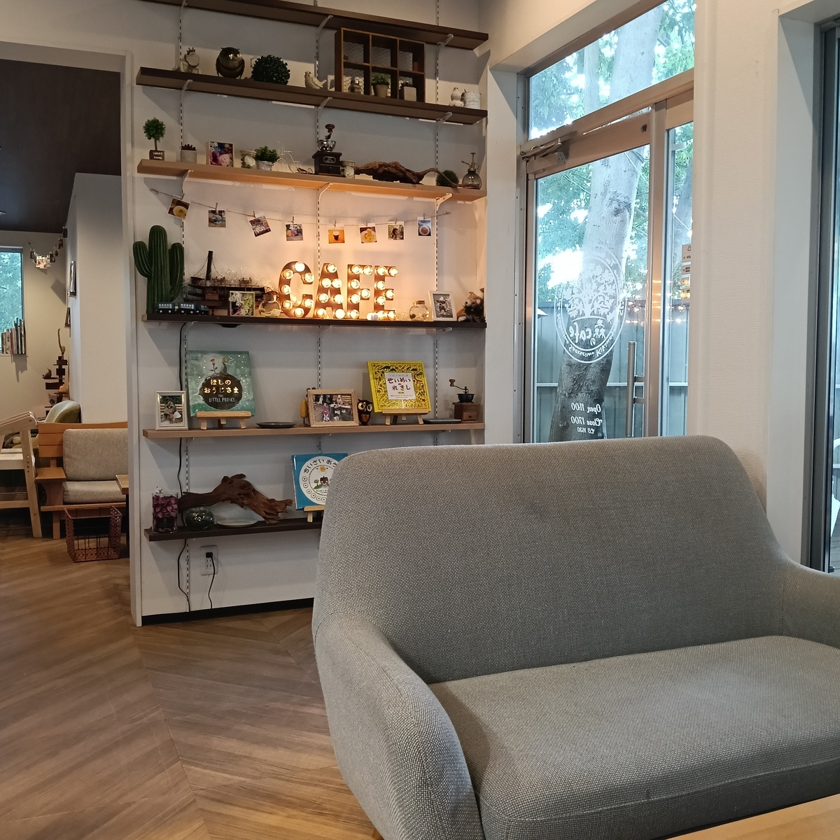 棚には小物や絵本、そして「CAFE」の電飾が置かれて可愛らしいです。