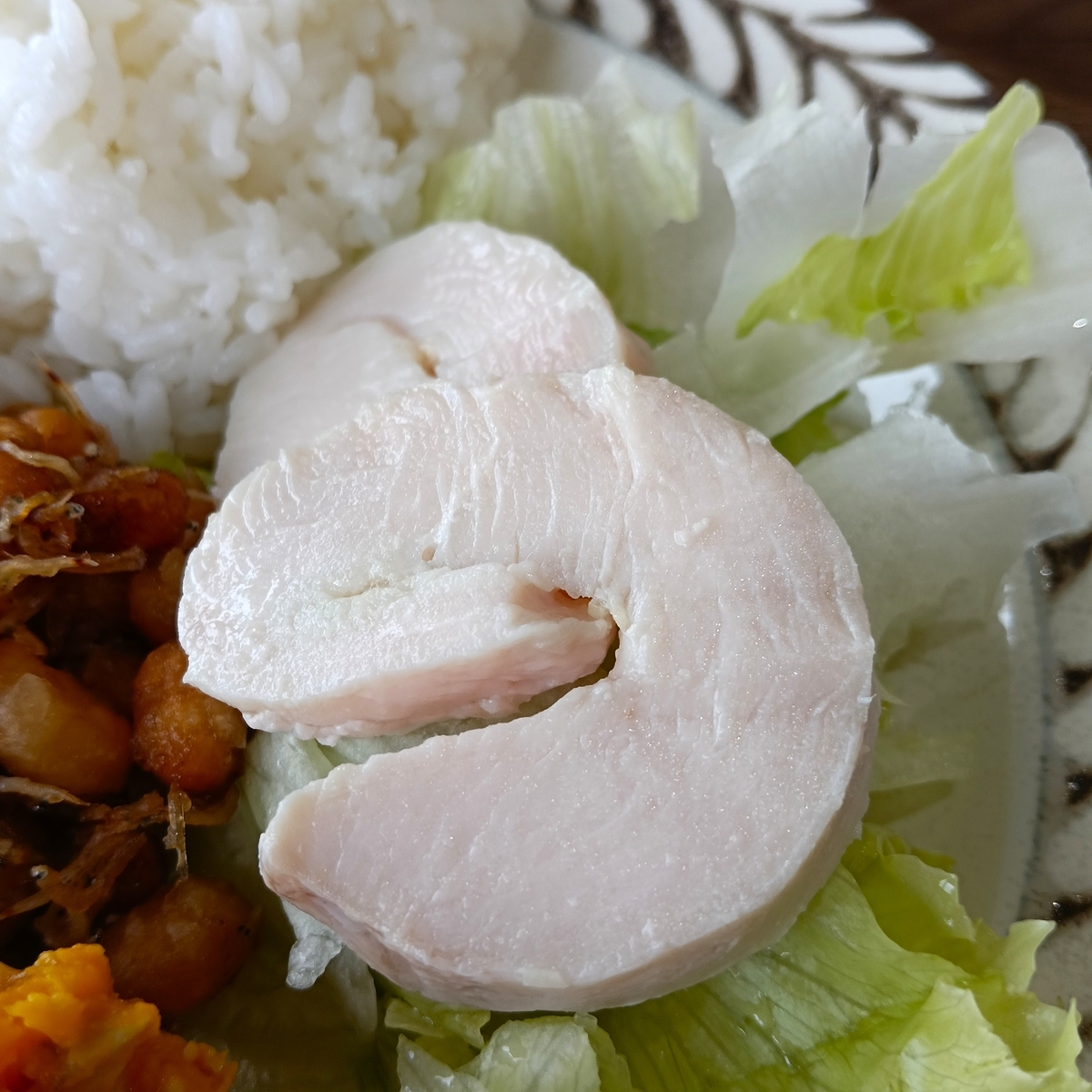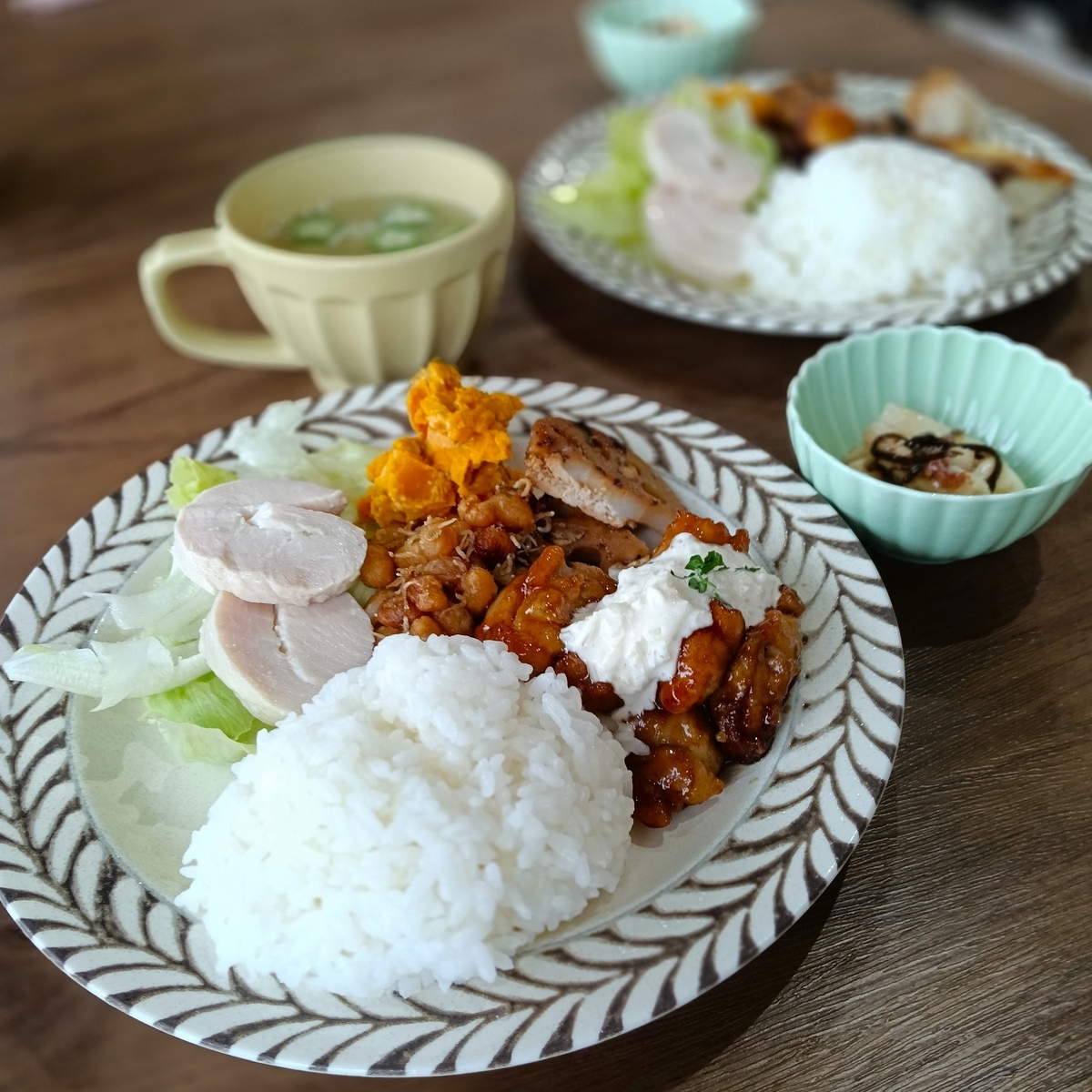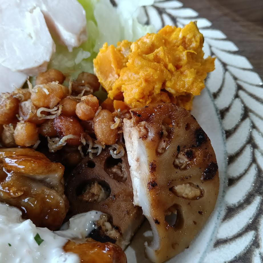 ↑副菜にはれんこんつくね、大豆とじゃこの甘辛炒め、かぼちゃサラダを選びました。