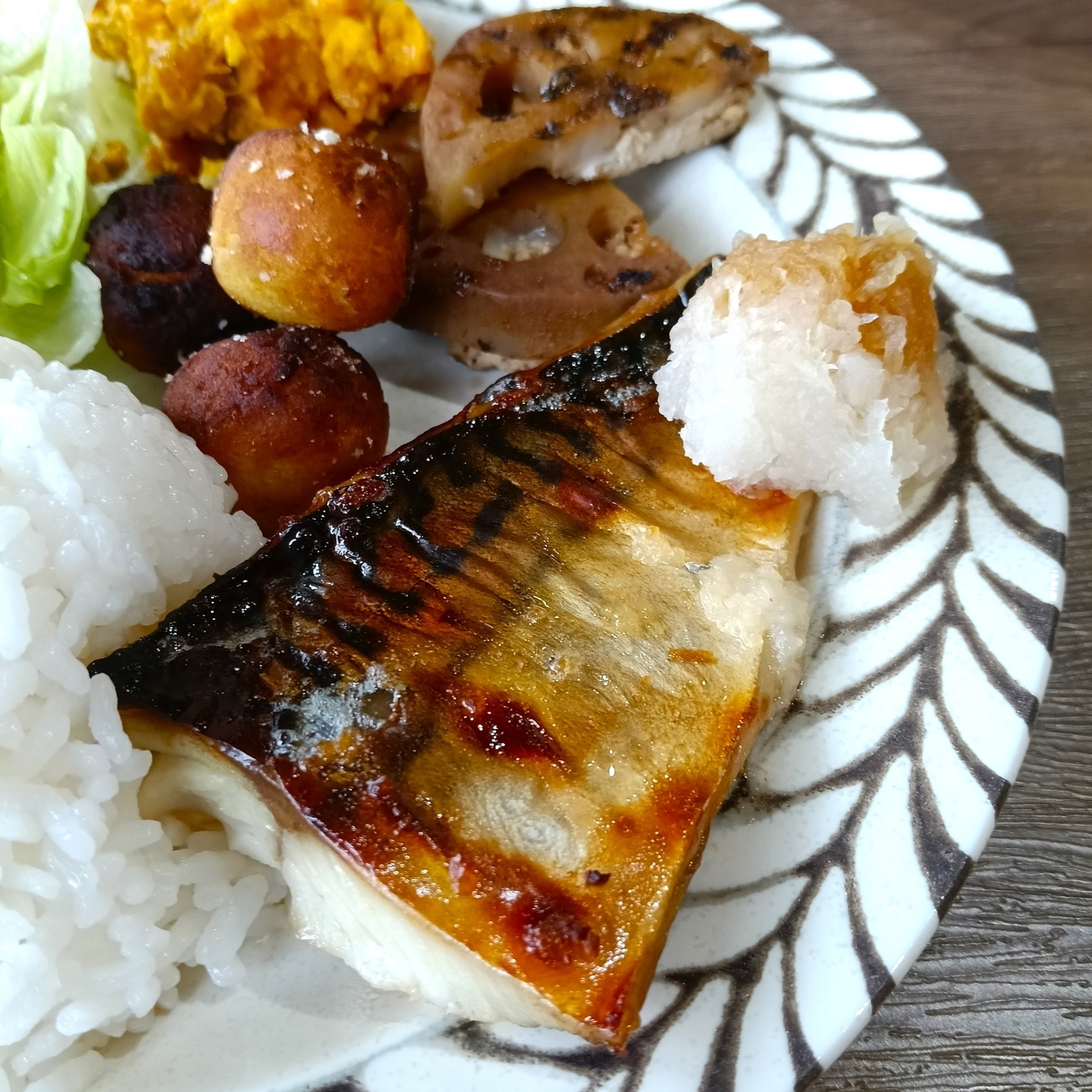鯖のとなりの丸っこい副菜は、カリっとしたおさつボールです。