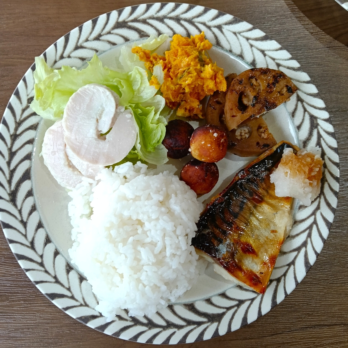↑お肉だけでなく、お魚をメインにするこもでき、今日は鯖の塩麴焼きでした。